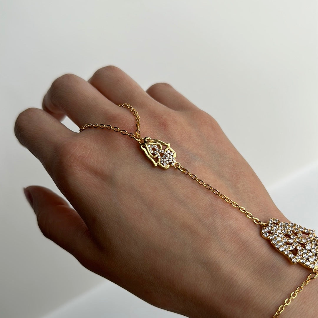 The Khamsa Bracelet is more than just a beautiful accessory, it also offers protection from the evil eye. Crafted with gold-plated silver and sparkly gems, this unique piece is sure to turn heads! Luxurious and limited, don't miss your chance to experience the power of Khamsa.