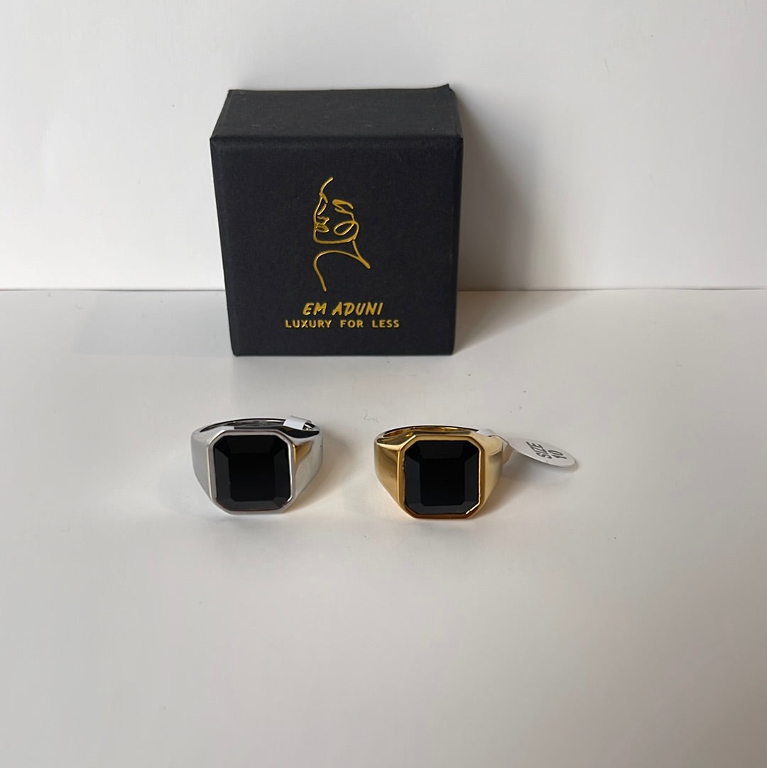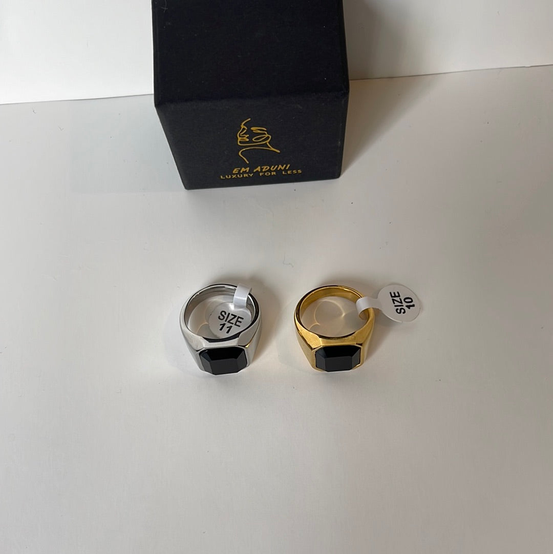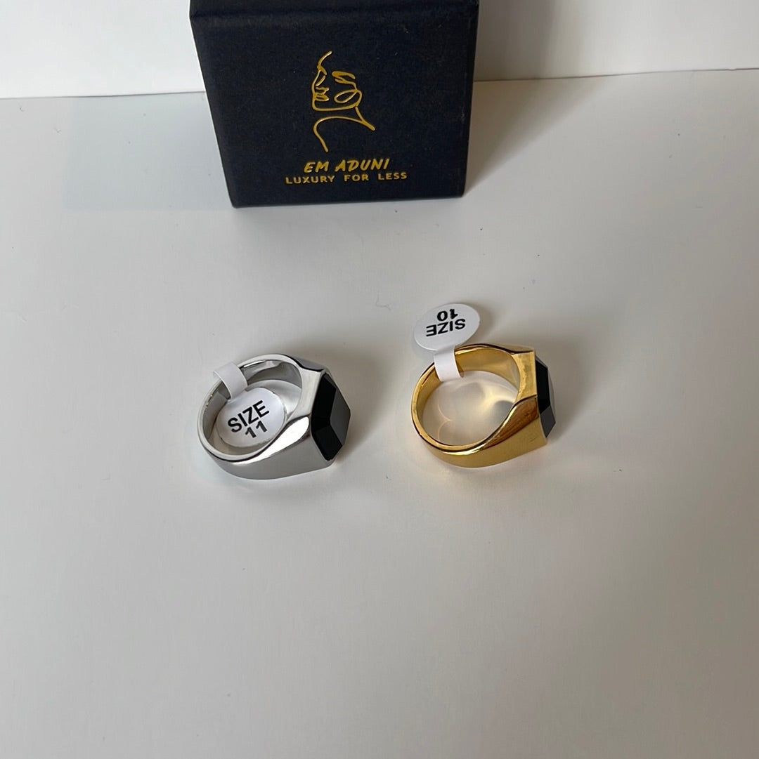 This simple yet elegant black stone ring will add a touch of femininity to your everyday look. Crafted with either silver or gold metal and available in multiple sizes, this piece is perfect for any occasion. Get yours now for a limited time!